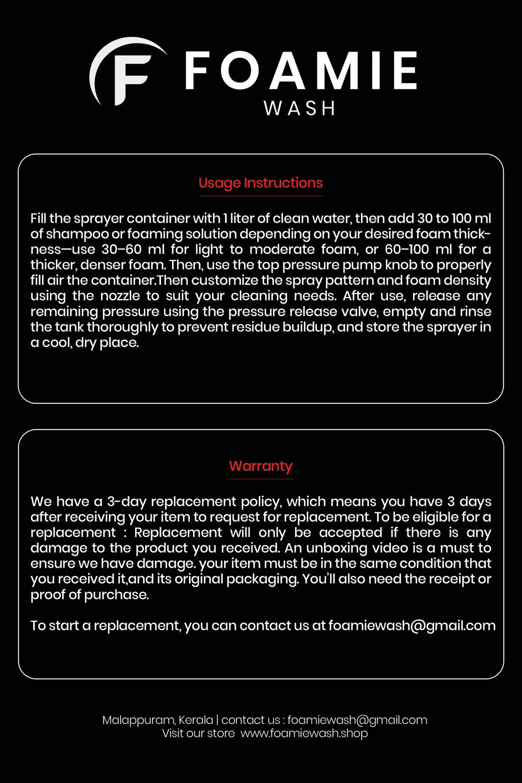 Fill the sprayer container with 1 liter of clean water, then add 30 to 100 ml of shampoo or foaming solution depending on your desired foam thickness—use 30–60 ml for light to moderate foam, or 60–100 ml for a thicker, denser foam. Then, use the top pressure pump knob to properly fill air the container.then customize the spray pattern and foam density using the nozzle to suit your cleaning needs. After use, release any remaining pressure using the pressure release valve, empty and rinse the tank thoroughly to prevent residue buildup, and store the sprayer in a cool, dry place.